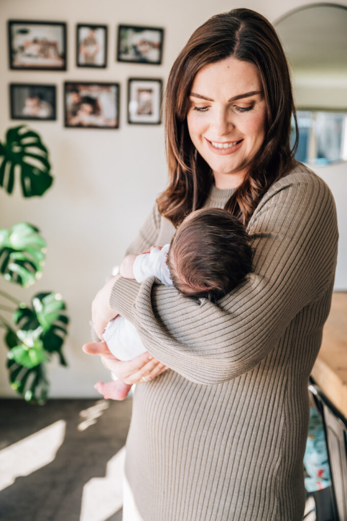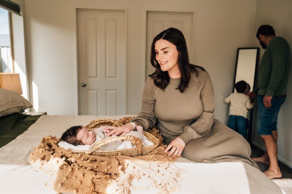 This type of newborn photography focuses less on styling and props and more on real moments. Snuggling on the bed. Feeding in the chair. Big siblings climbing in for a cuddle. The hallway where you walk baby back and forth to settle them.